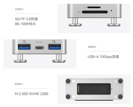 純機箱版可實現將設備“立”起來,節省桌面空間、加速設備散熱的基礎功能。DIY擴容版新增4個全能接口:2個USB-A口(10Gbps),2個支持3.0同讀的TF卡+SD卡讀卡口。底部額外增加一個M.2硬盤插槽,最高可DIY擴容8TB。