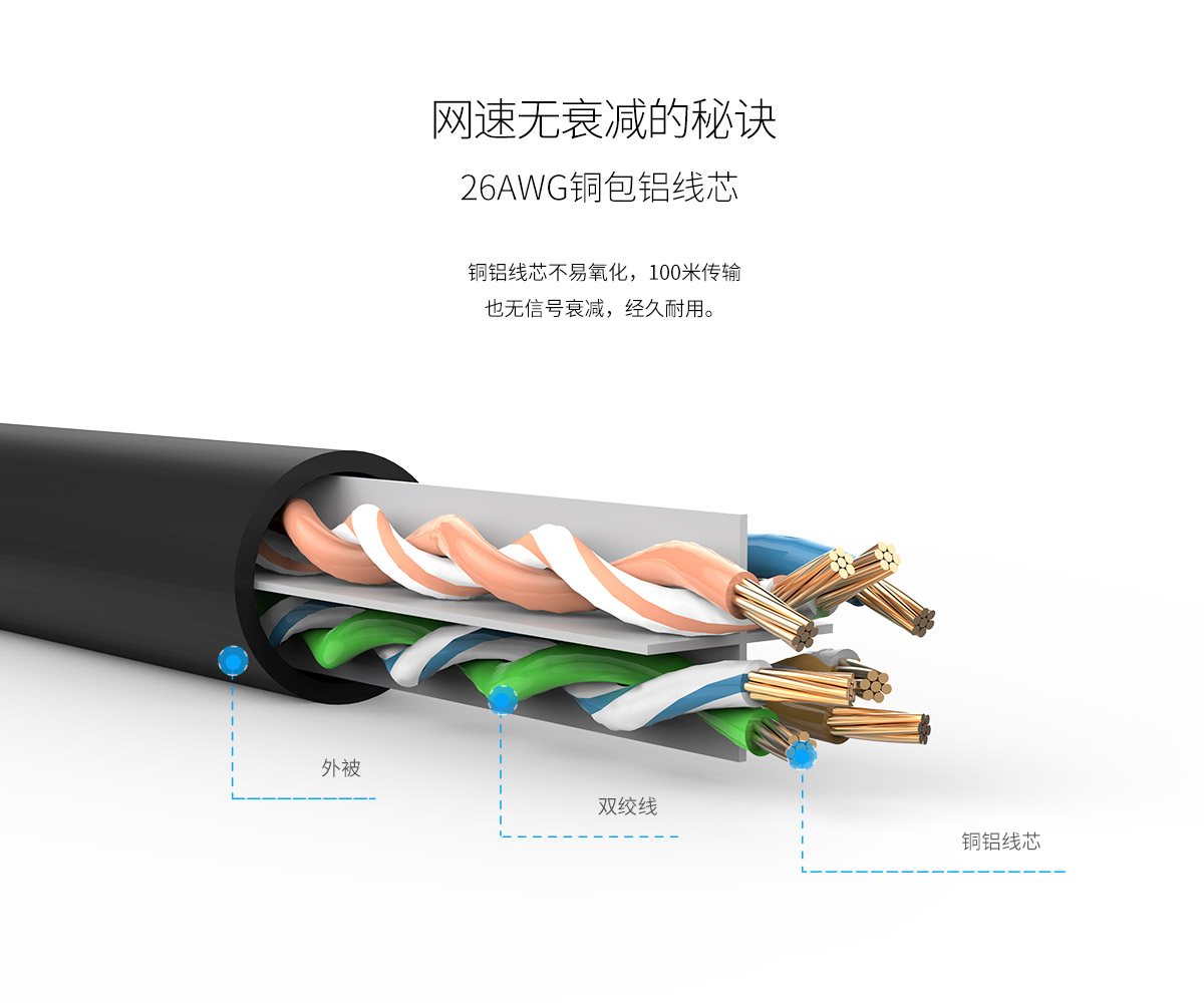 千兆帶寬,純銅線芯,8芯雙絞,PVC材質,普通水晶接口
