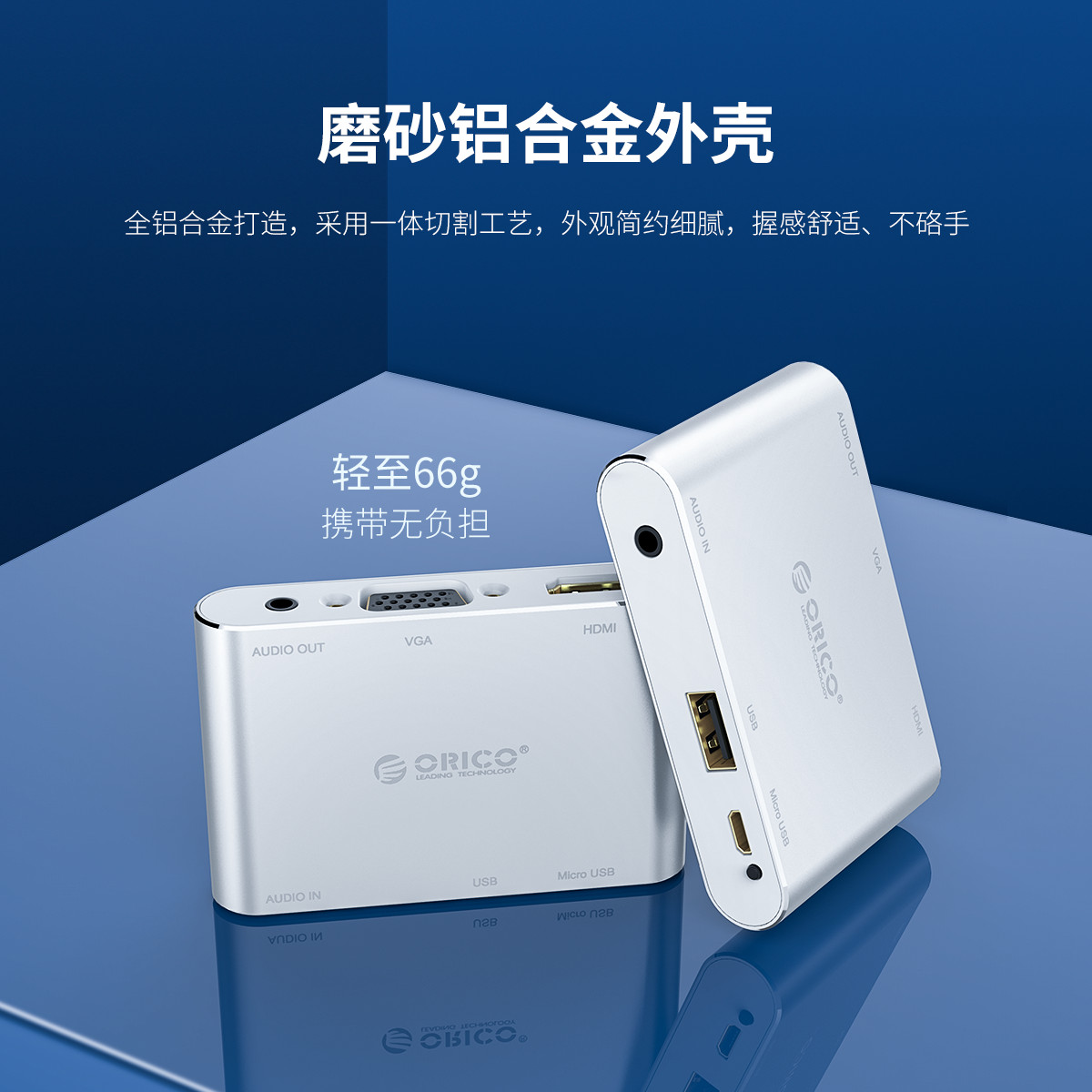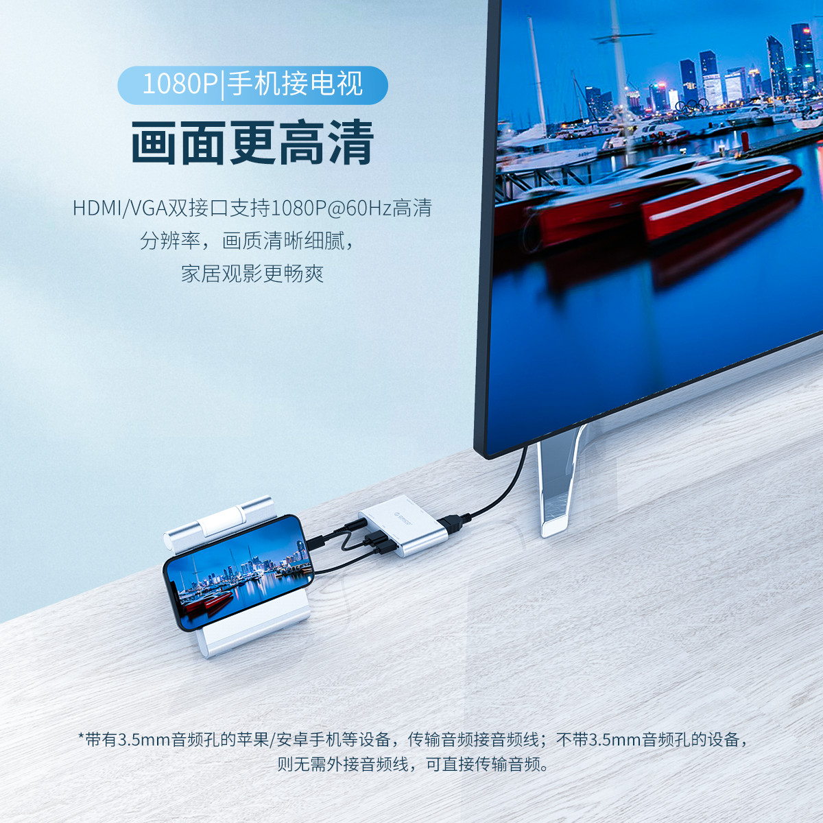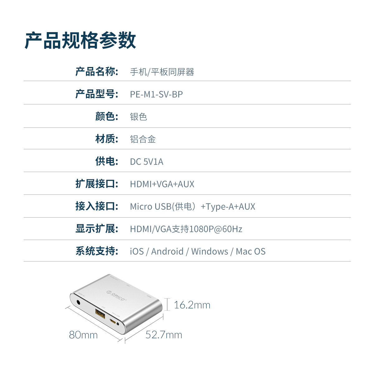 1080P@60HZ高清分辨率,HDMI/VGA雙接口,3.5MM獨(dú)立音頻輸出,外接供電,即插即用,鋁合金外殼