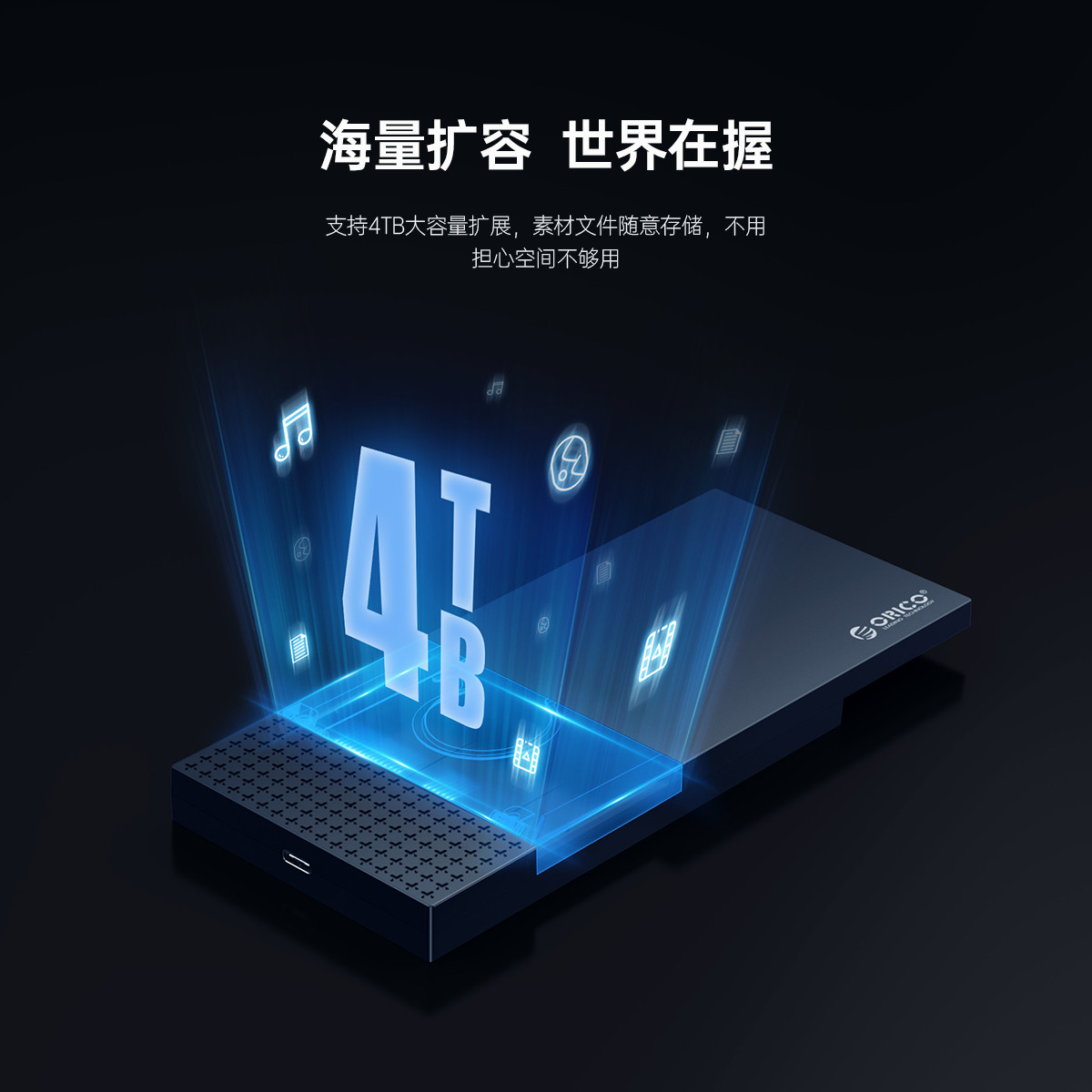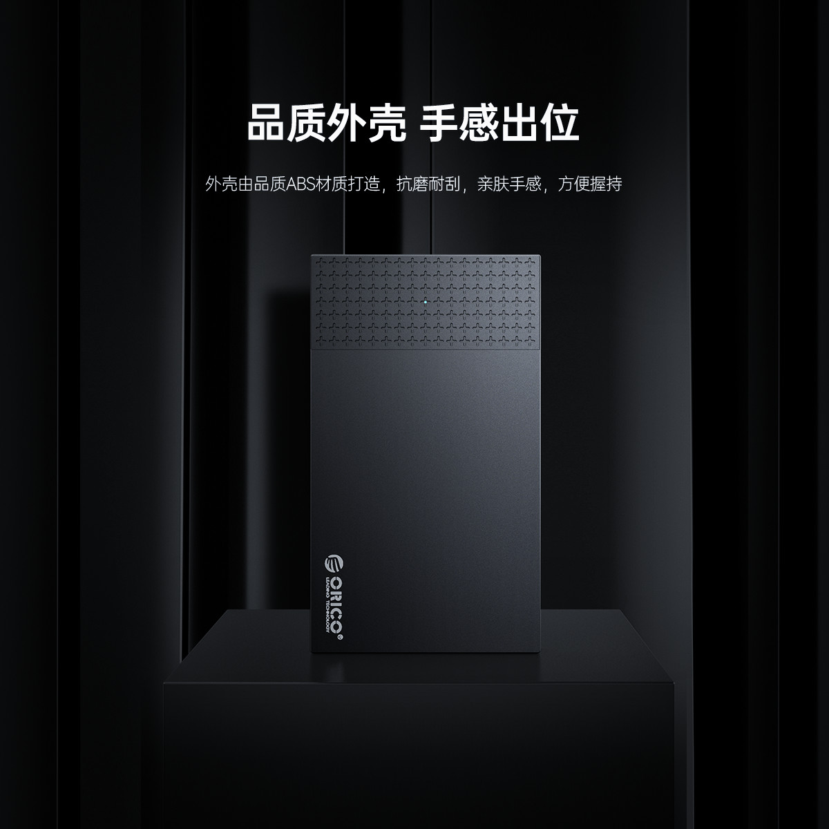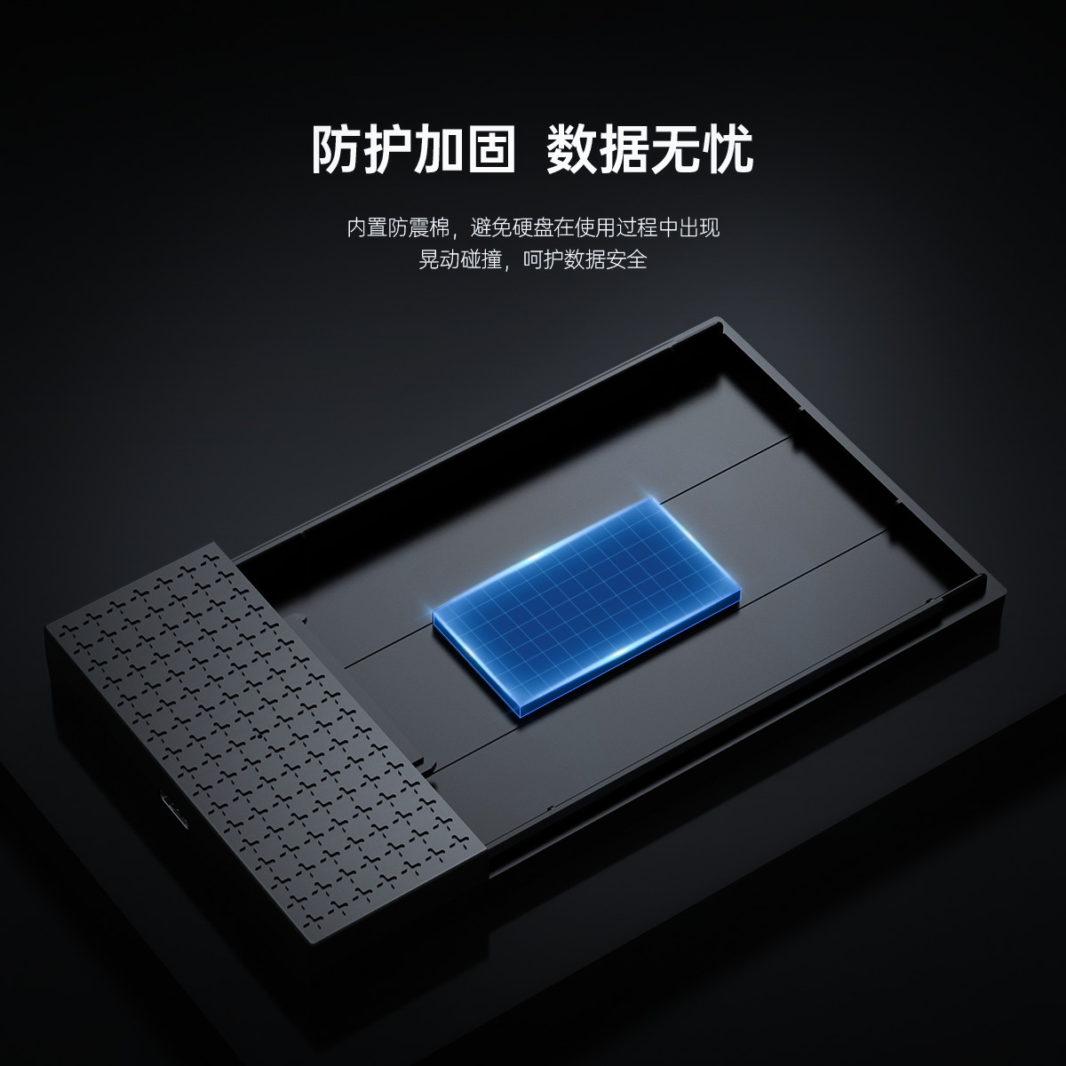 USB3.1 2.5英寸機械/固態硬盤通用,支持4TB大容量擴展,內置防震棉,外殼由品質ABS材質打造,免工具設計