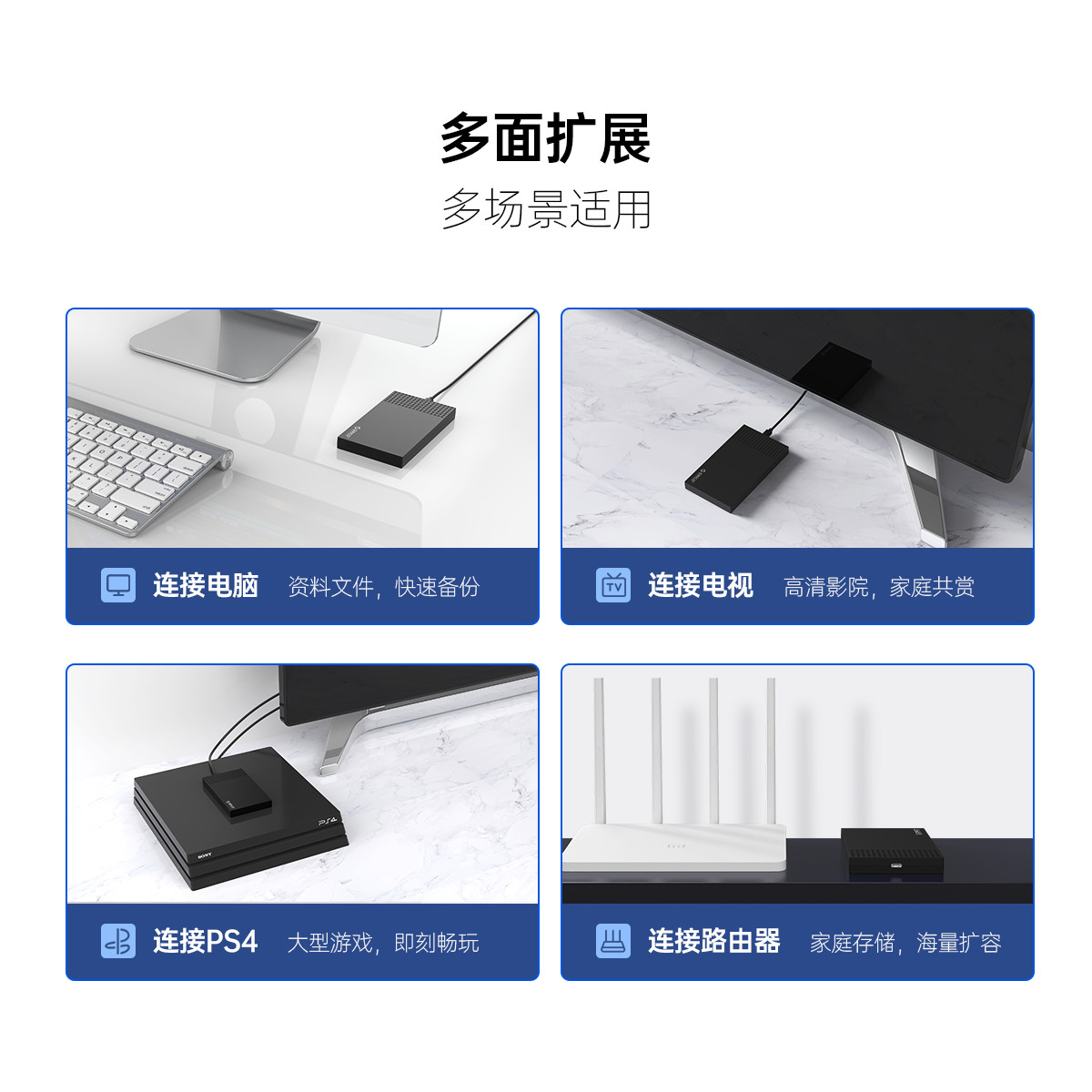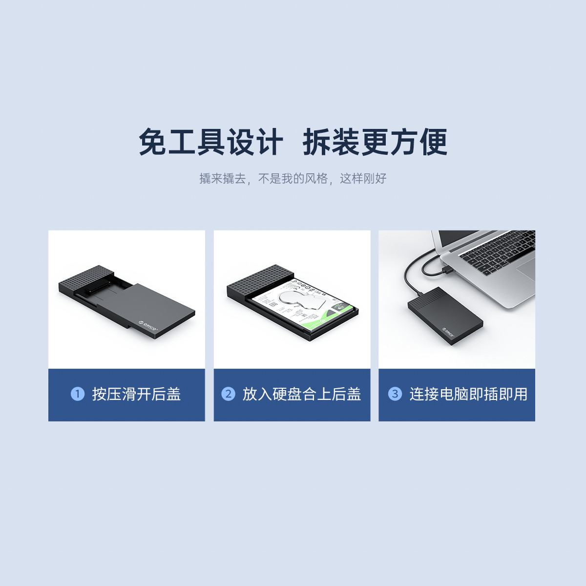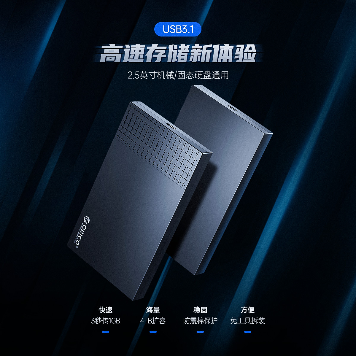 USB3.1 2.5英寸機械/固態硬盤通用,支持4TB大容量擴展,內置防震棉,外殼由品質ABS材質打造,免工具設計