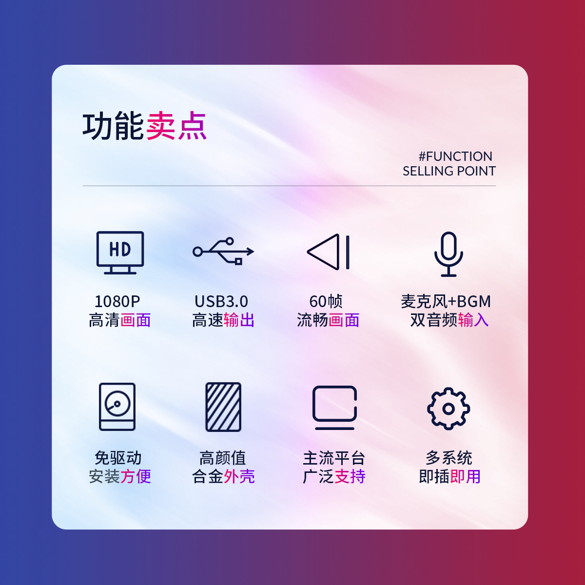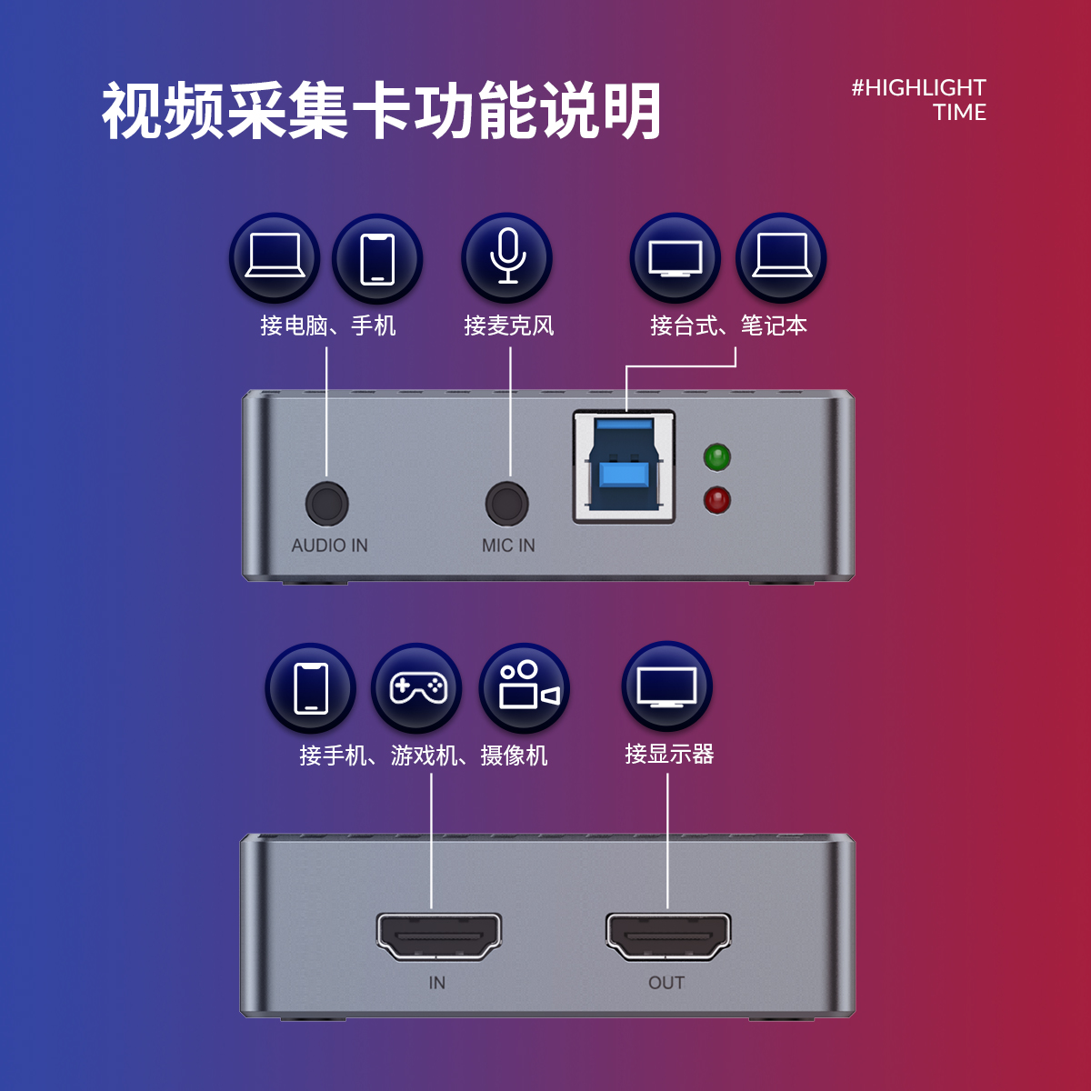 USB-A 3.0*1(連接電腦),HDMI*1(1080P@60Hz視頻輸入),音頻*2(兩路音頻輸入)