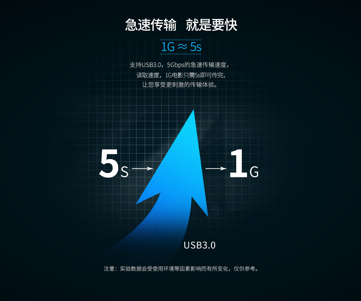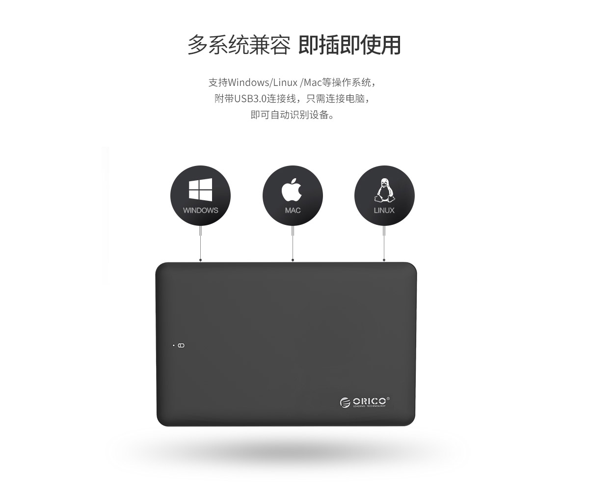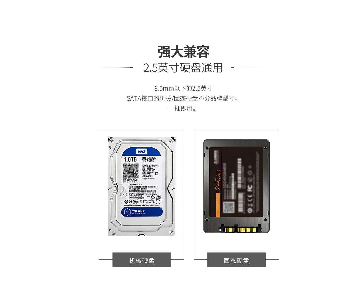 支持9.5mm及以下2.5寸機(jī)械硬盤、SSD固態(tài)硬盤,采用USB3.0接口5Gbps傳輸,免工具安裝,即插即用。