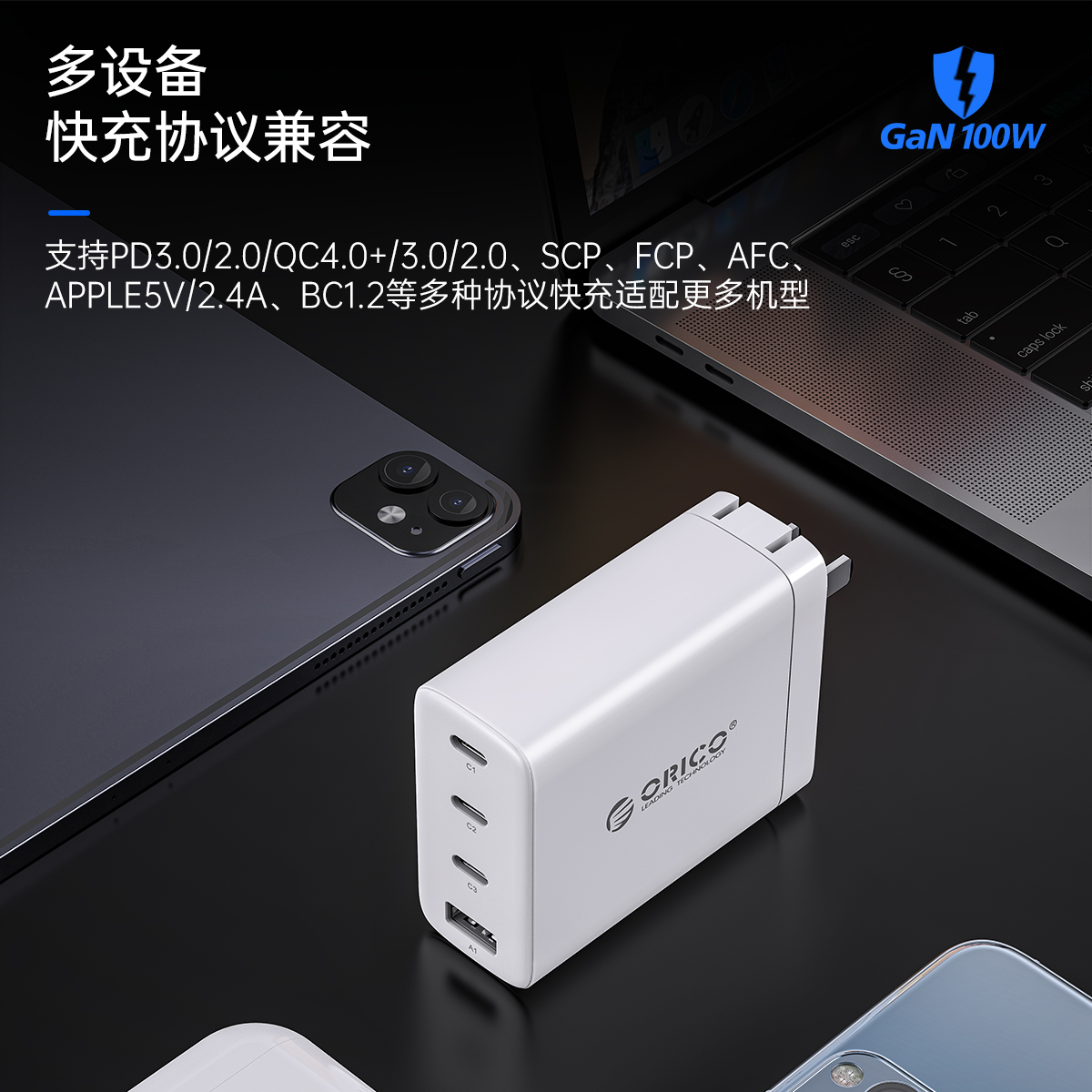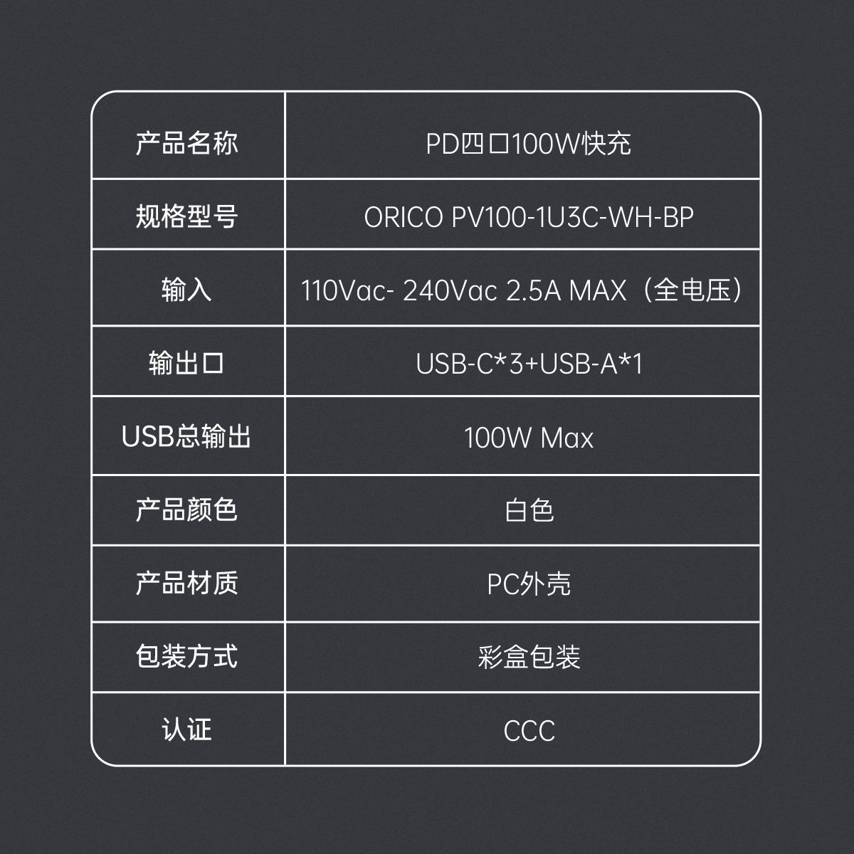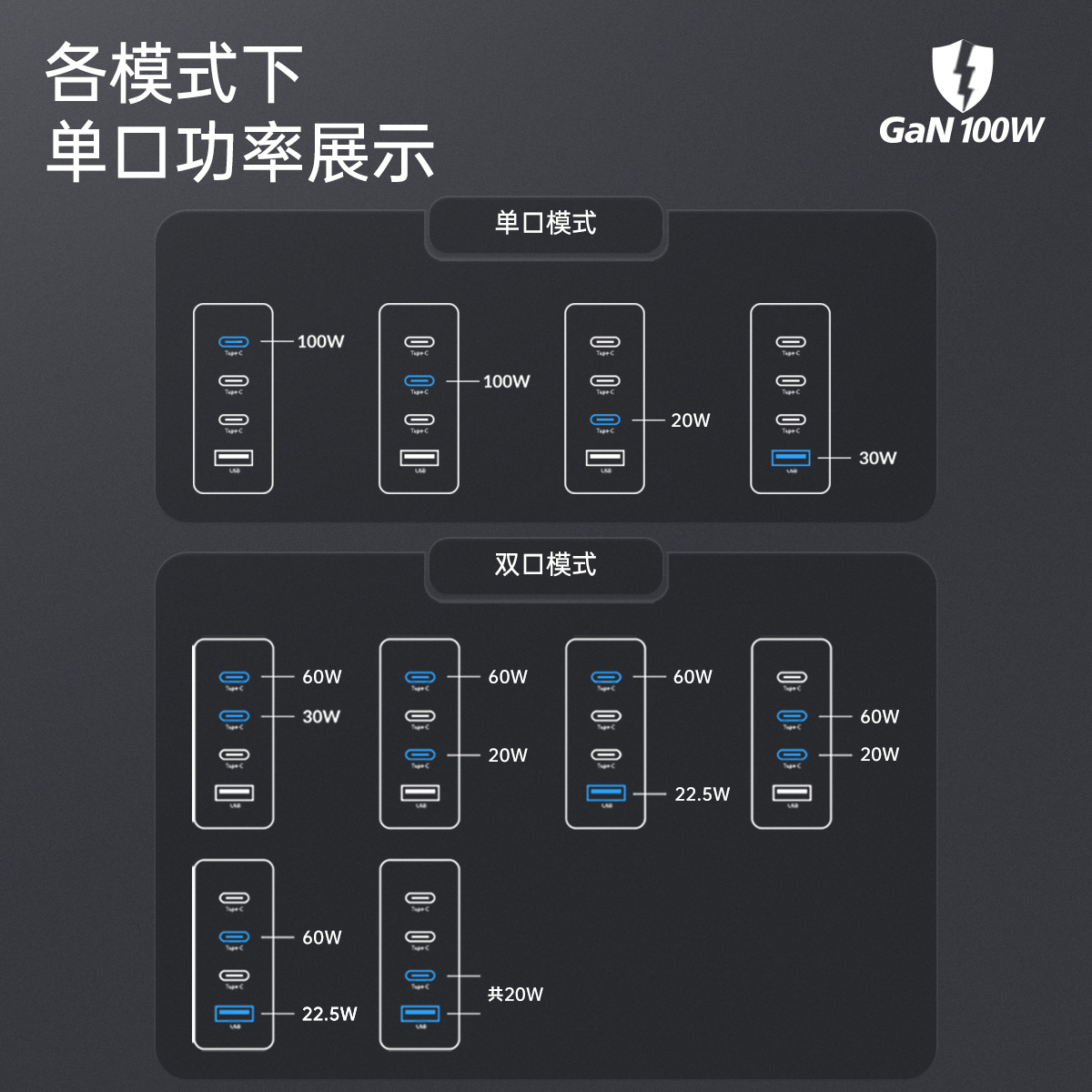 單口使用模式: C1 100W PD(5V/3A, 9V/3A, 12V/3A, 15V/3A, 20V/5A,); C2 100W PD(5V/3A, 9V/3A, 12V/3A, 15V/3A, 20V/5A,); C3 30W PD(5V/3A, 9V/3A, 12V/2.5A, 15V/2A, 20V/1.5A,); USB-A 30W QC(4.5V/5A, 5V/4.5A, 9V/3A, 12V/2.5A, 20V/1.5A,) 雙口使用模式: C1+C2 60W PD+30W PD;C1+C3 60W PD+30W PD; C1+USB-A 60W PD+30W QC; C2+C3 60W PD+30W PD ; C2+USB-A 60W PD+30W QC ; C3+USB-A 5V3A 或 5A 三口使用模式: C1+C2+C3 45W PD+30W PD+18W PD; C1+C2+USB-A 45W PD+18W PD+30W QC; C1+C3+USB-A 60W PD+15W(5V3A); C2+C3+USB-A 60W PD+15W(5V3A) 四口使用模式: C1+C2+C3+USB-A 45W PD+30W ; PD+15W(5V3A) PPS: 3.3V-21V 5A