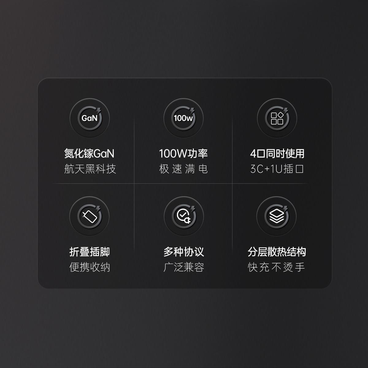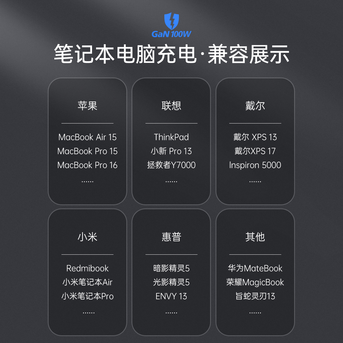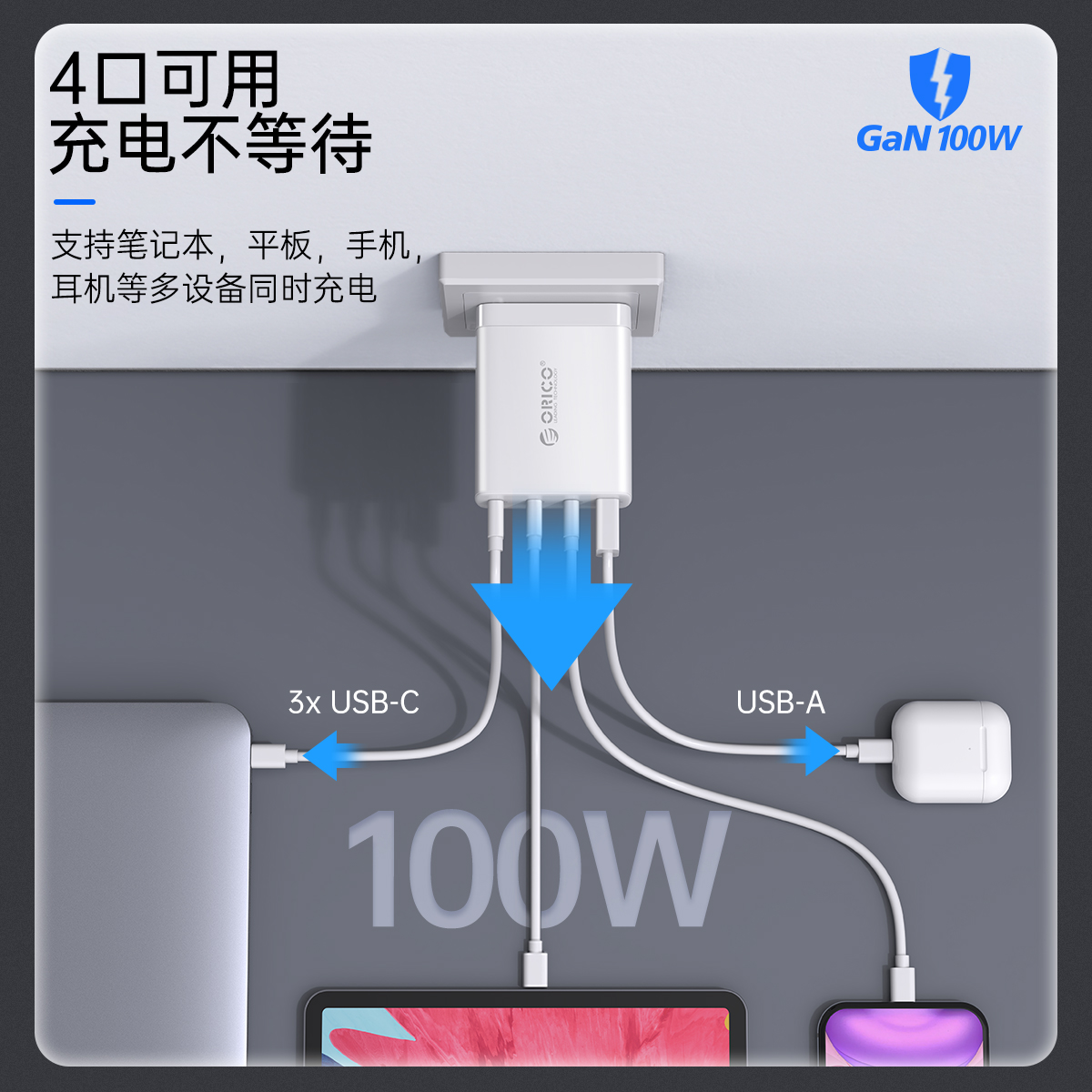 單口使用模式: C1 100W PD(5V/3A, 9V/3A, 12V/3A, 15V/3A, 20V/5A,); C2 100W PD(5V/3A, 9V/3A, 12V/3A, 15V/3A, 20V/5A,); C3 30W PD(5V/3A, 9V/3A, 12V/2.5A, 15V/2A, 20V/1.5A,); USB-A 30W QC(4.5V/5A, 5V/4.5A, 9V/3A, 12V/2.5A, 20V/1.5A,) 雙口使用模式: C1+C2 60W PD+30W PD;C1+C3 60W PD+30W PD; C1+USB-A 60W PD+30W QC; C2+C3 60W PD+30W PD ; C2+USB-A 60W PD+30W QC ; C3+USB-A 5V3A 或 5A 三口使用模式: C1+C2+C3 45W PD+30W PD+18W PD; C1+C2+USB-A 45W PD+18W PD+30W QC; C1+C3+USB-A 60W PD+15W(5V3A); C2+C3+USB-A 60W PD+15W(5V3A) 四口使用模式: C1+C2+C3+USB-A 45W PD+30W ; PD+15W(5V3A) PPS: 3.3V-21V 5A