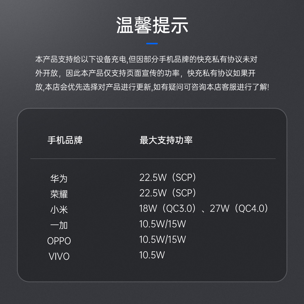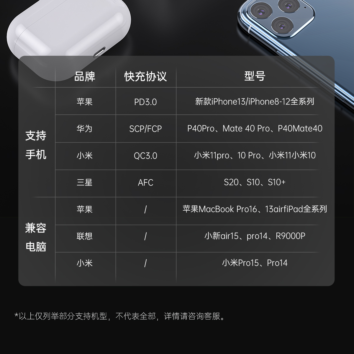 USB-A : BC1.2、Apple2.4A、 QC2.0 ClassA、QC3.0 ClassA、Samsung 2.0A、FCP、SCP、AFC、PE1.0、PE2.0  USB-C : BC1.2、Apple2.4A、 QC2.0 ClassA、QC3.0 ClassA、PD2.0、PD3.0、PPS、FCP、SCP、AFC、PE1.0、PE2.0、PPS(C2口)