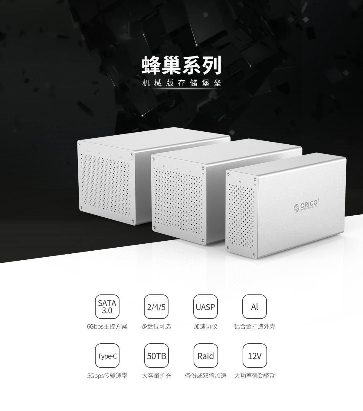 支持50TB容量,支持UASP加速協議,蜂窩式對流散熱,支持智能休眠