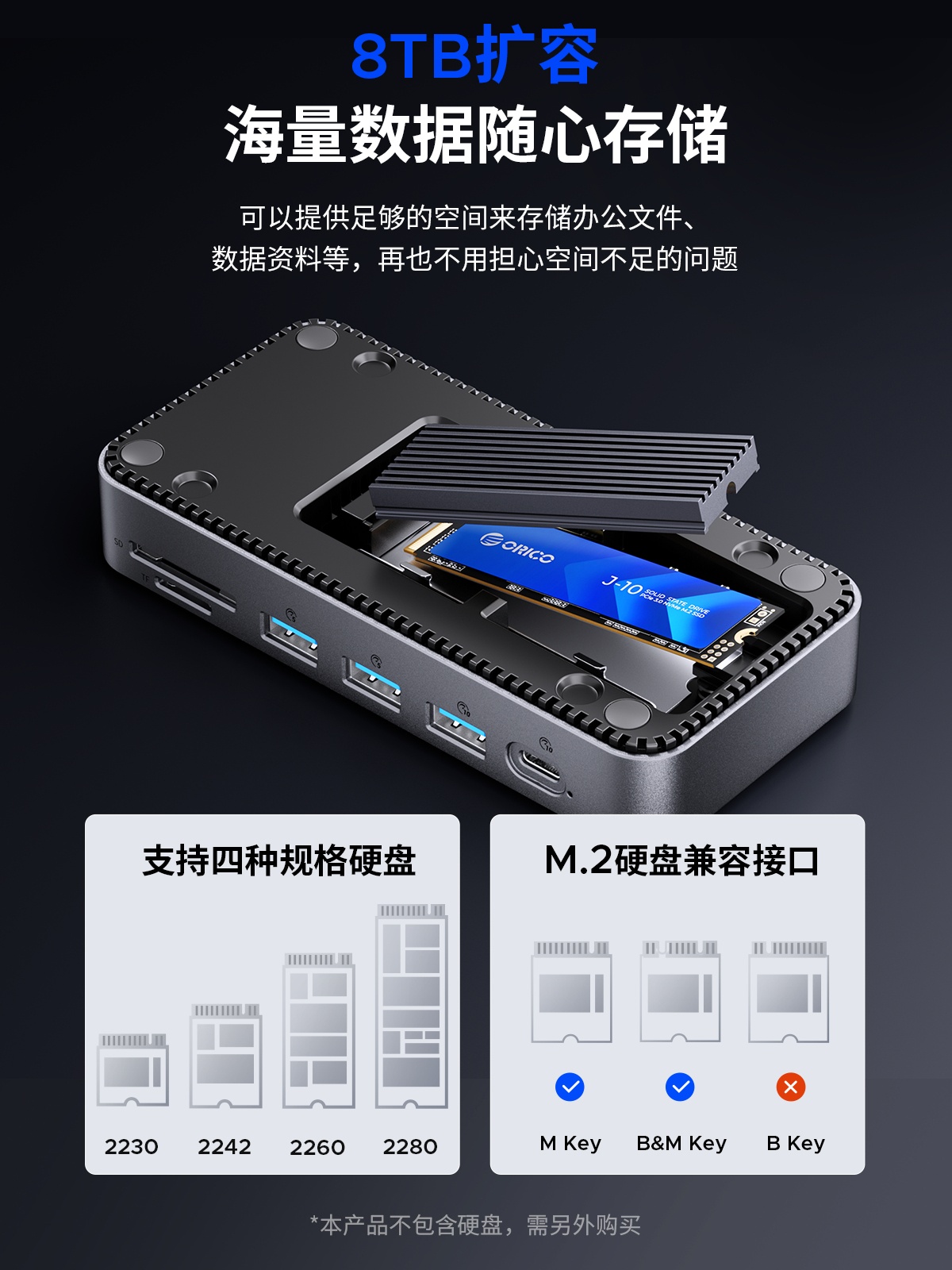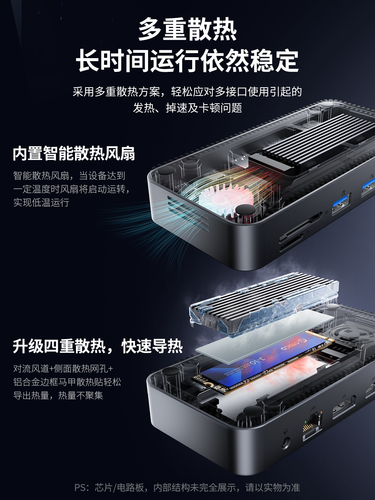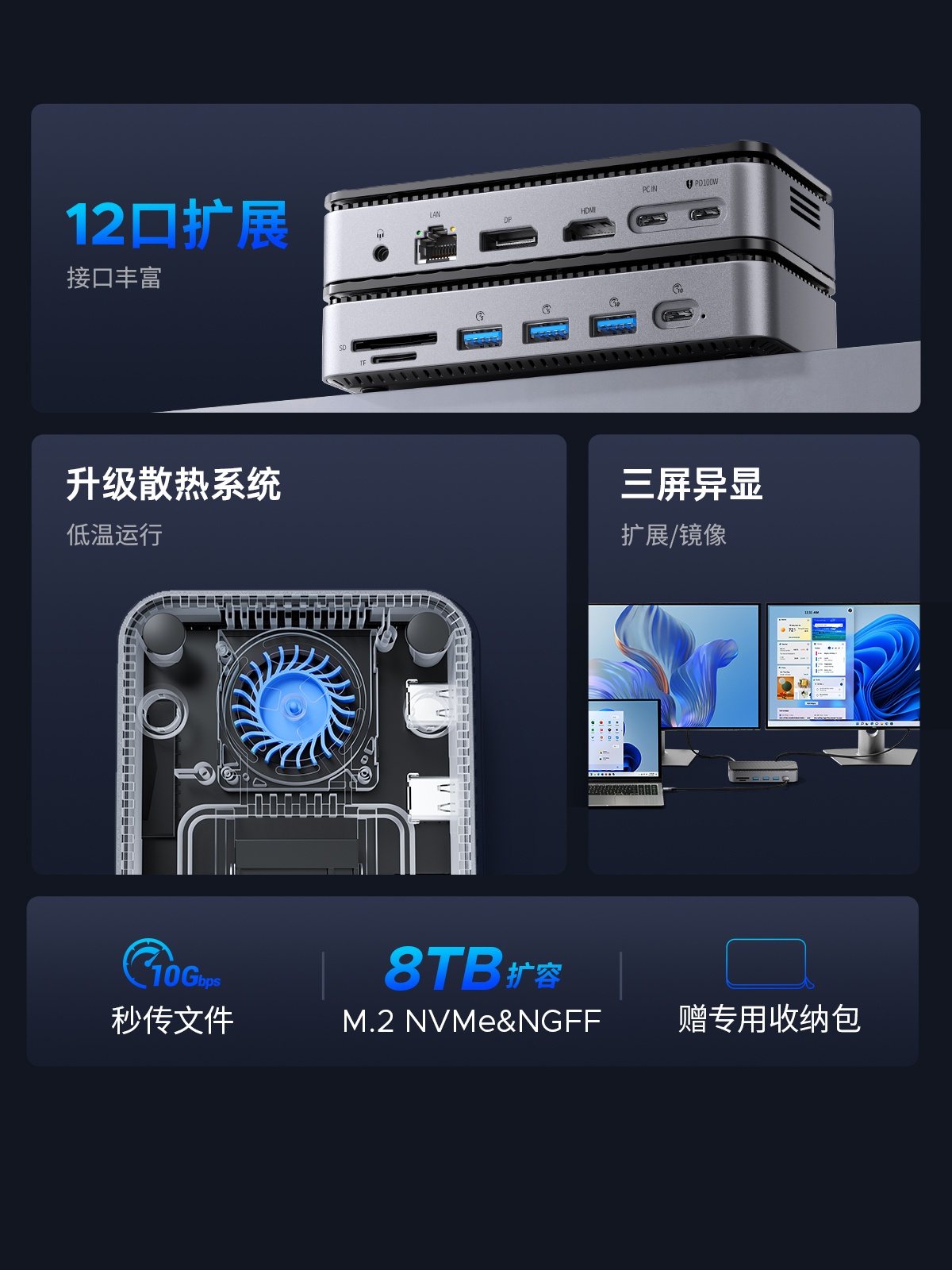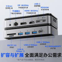 M.2(NVME&NGFF)*1、USB-C(10Gbps)*1、USB-A(10Gbps)*1、USB-A(5Gbps)*2、SD/TF 3.0(同讀)*1、RJ45(千兆)*1、3.5mm耳麥一體*1、PD100W*1、HDMI(8K30hz/4K60HZ)、DP(8K30hz/4K60HZ)最高支持倆個視頻信號,單顯可達8K30HZ,同顯可達4K60HZ