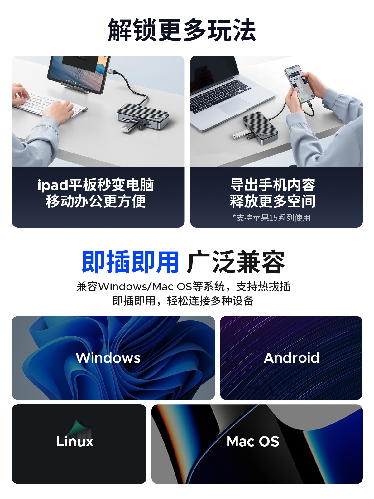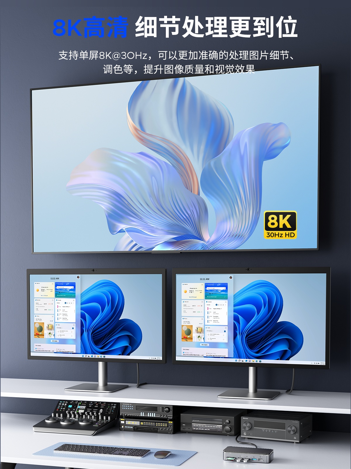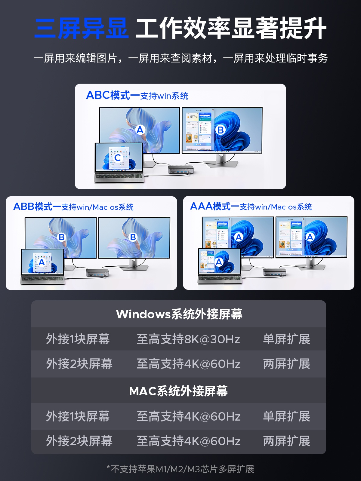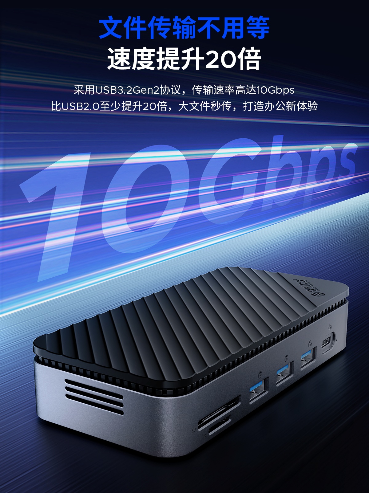 M.2(NVME&NGFF)*1、USB-C(10Gbps)*1、USB-A(10Gbps)*1、USB-A(5Gbps)*2、SD/TF 3.0(同讀)*1、RJ45(千兆)*1、3.5mm耳麥一體*1、PD100W*1、HDMI(8K30hz/4K60HZ)、DP(8K30hz/4K60HZ)最高支持倆個視頻信號,單顯可達8K30HZ,同顯可達4K60HZ