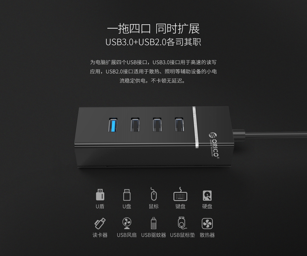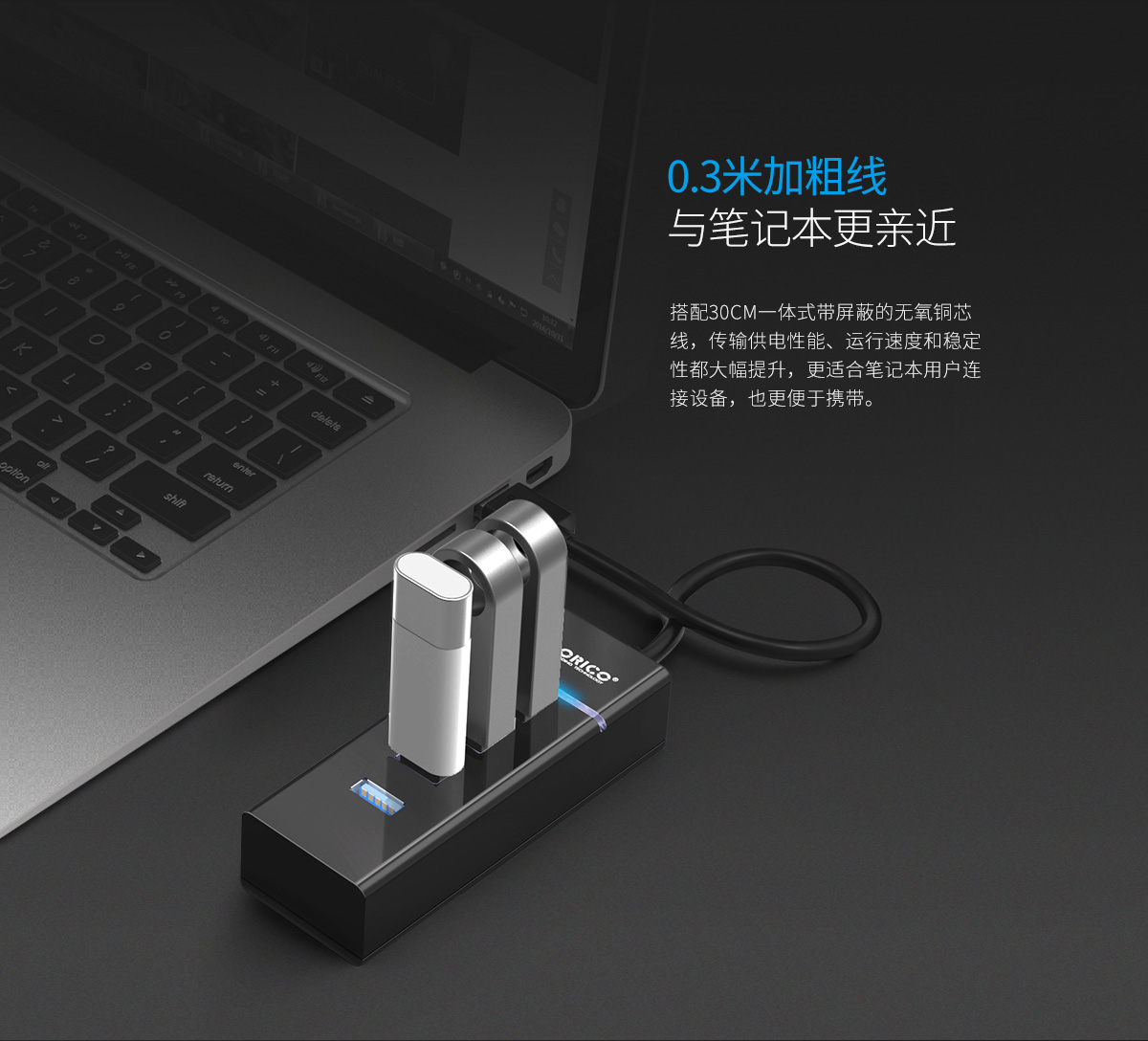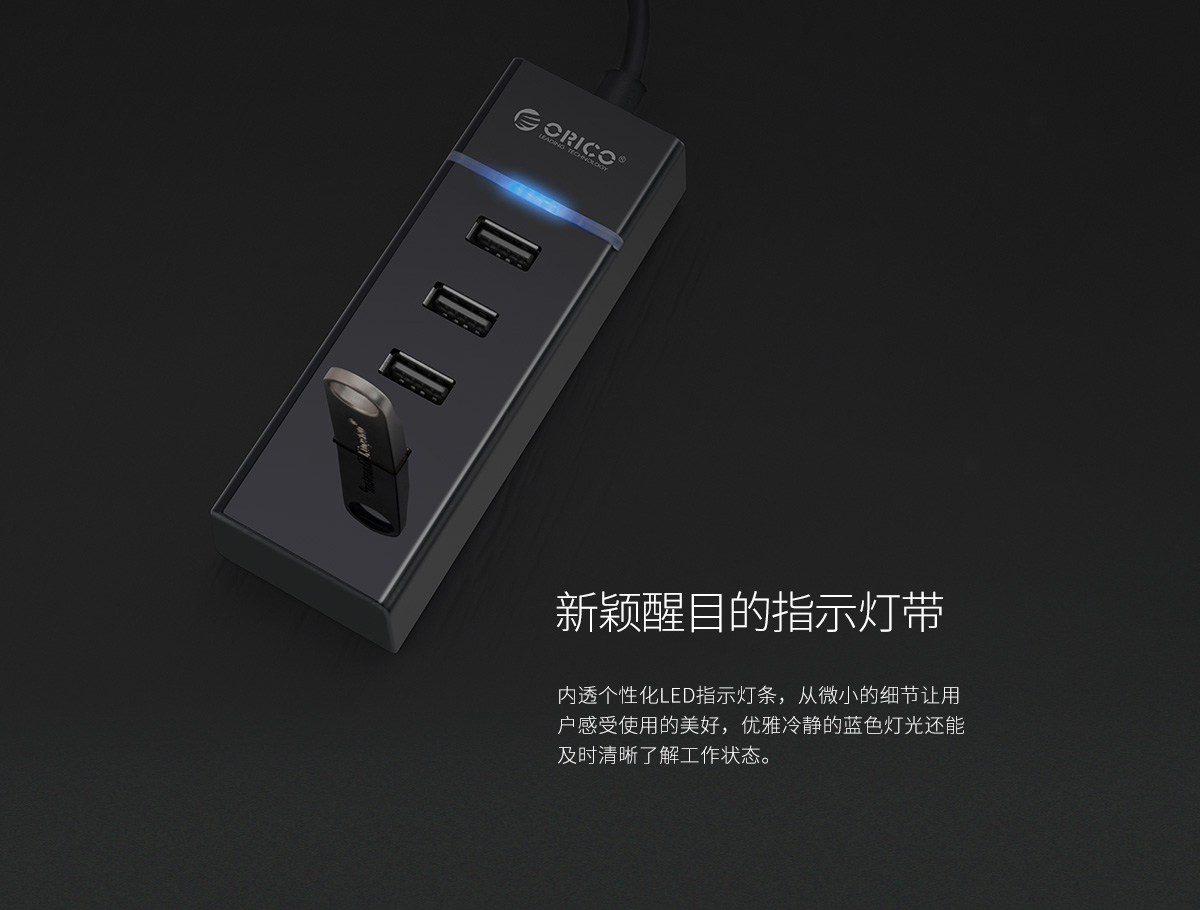 連體設計 30cm數據線長 內透LED指示燈 3+1USB接口擴展