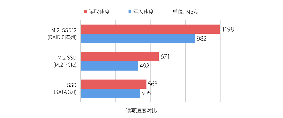 普通M.2接口的SSD,讀寫速度一般在3-400MB/S左右。通過磁盤陳列RAID 0模式,讓普通M.2速度提升兩倍,讓電腦主板上的PCIE高速接口發揮它真正的性能,實際讀取可達800MB/S,寫入達700MB/S,遠遠地甩開一般固態硬盤一條街!