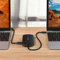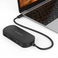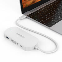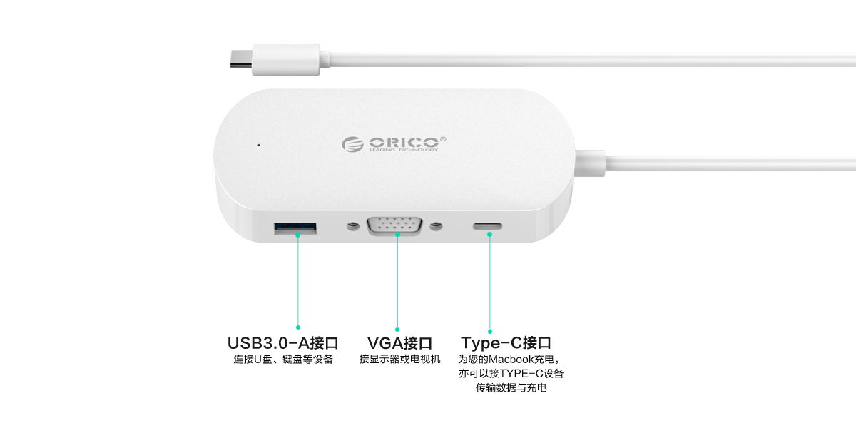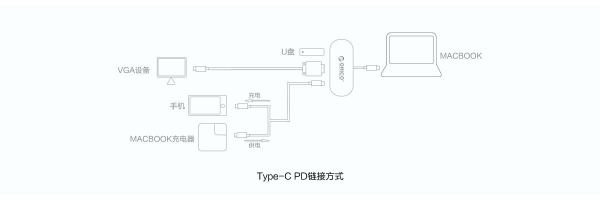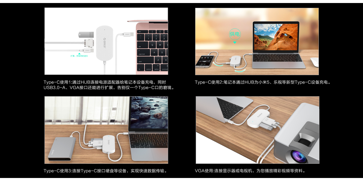 Type-C使用1,通過HUB連接電源適配器給筆記本設(shè)備充電,同時(shí)USB3.0-A、VGA接口還能進(jìn)行擴(kuò)展,告別筆記本只有一個(gè)Type-C接口的窘境;