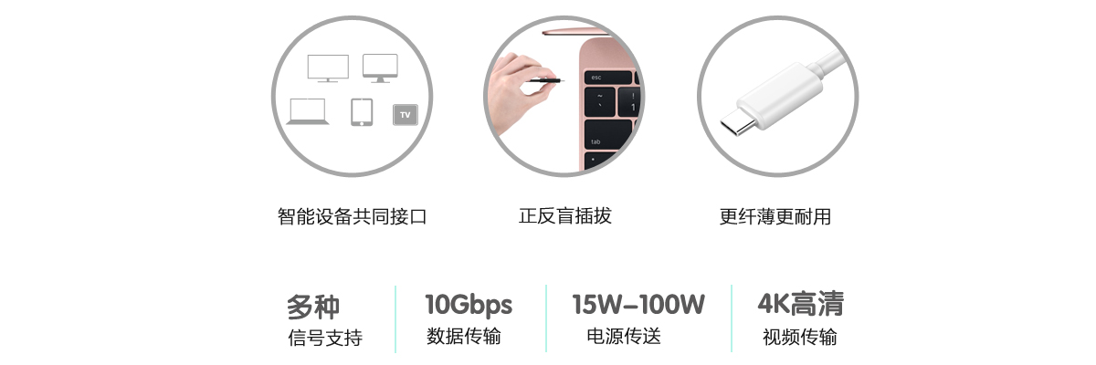 Type-C擁有正反盲插拔的易用性,且其更纖薄更耐用,同一條線纜可支持USB2.0、USB3.0、PCIe、DisplayPort和Thunderbolt等多種信號(hào),同時(shí)擁有更高數(shù)據(jù)傳輸效率(10Gbps)、大功率電源傳送(15W-100W)、可實(shí)現(xiàn)4K高清視頻傳輸,將成為新生代設(shè)備的主流接口。