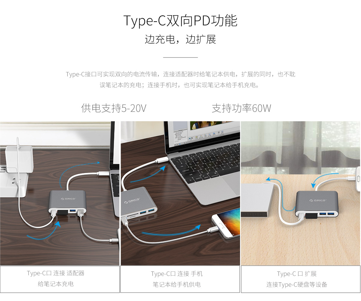 TYPE-C接口支持雙向PD供電+數(shù)據(jù)傳輸功能,PD供電支持5-20V,60W Max