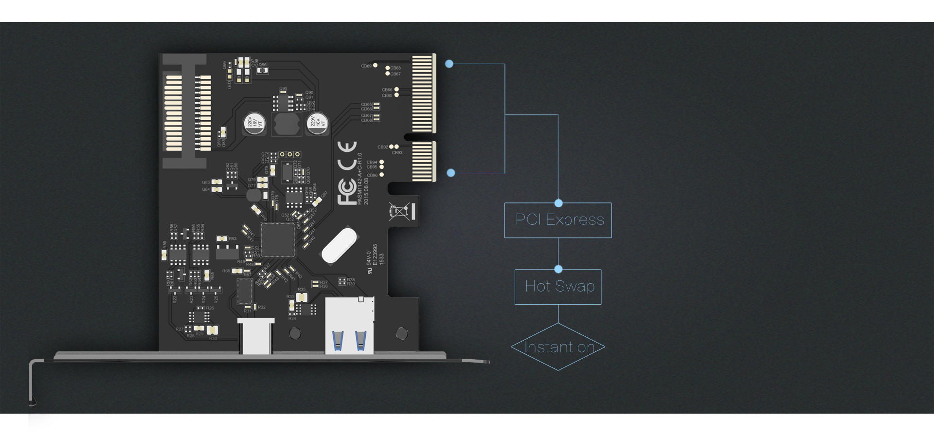 簡便安裝在機箱對應的PCI Express插槽,擴展更為迅速,產品支持熱插拔,瞬間啟動,便于多個USB進行更換,在連接/斷開設備時,也無需關閉系統。