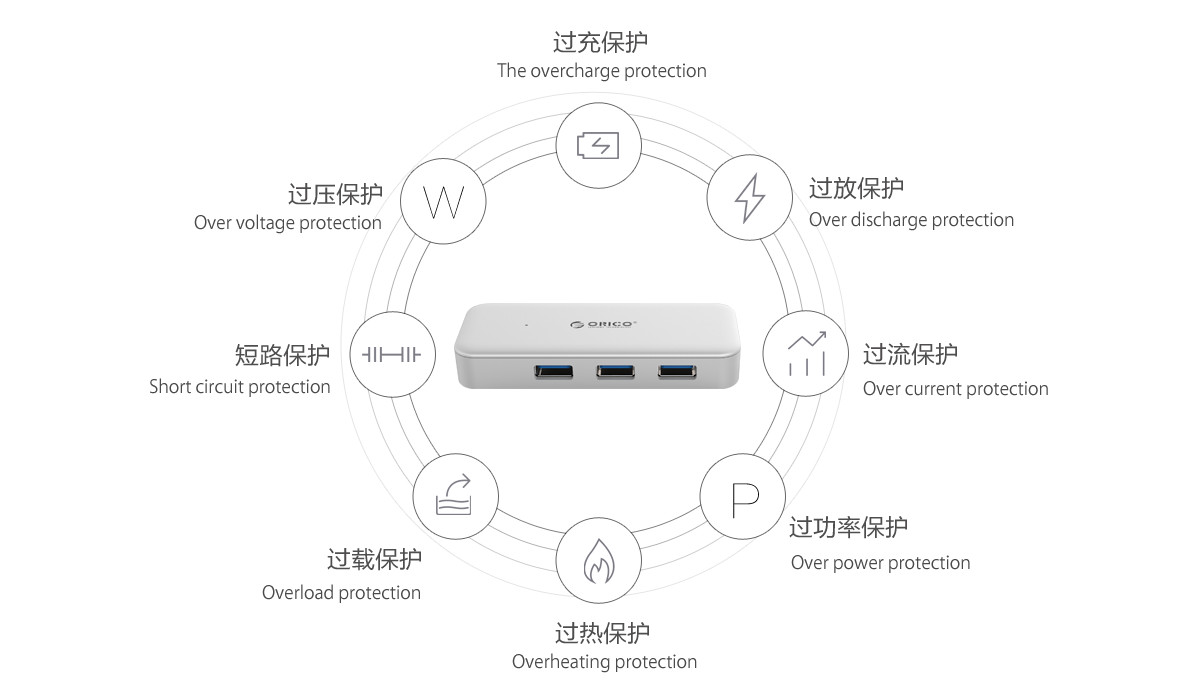 支持過載電壓及瞬間電流保護(hù)功能,有效保護(hù)被連接的設(shè)備和HUB本身。
