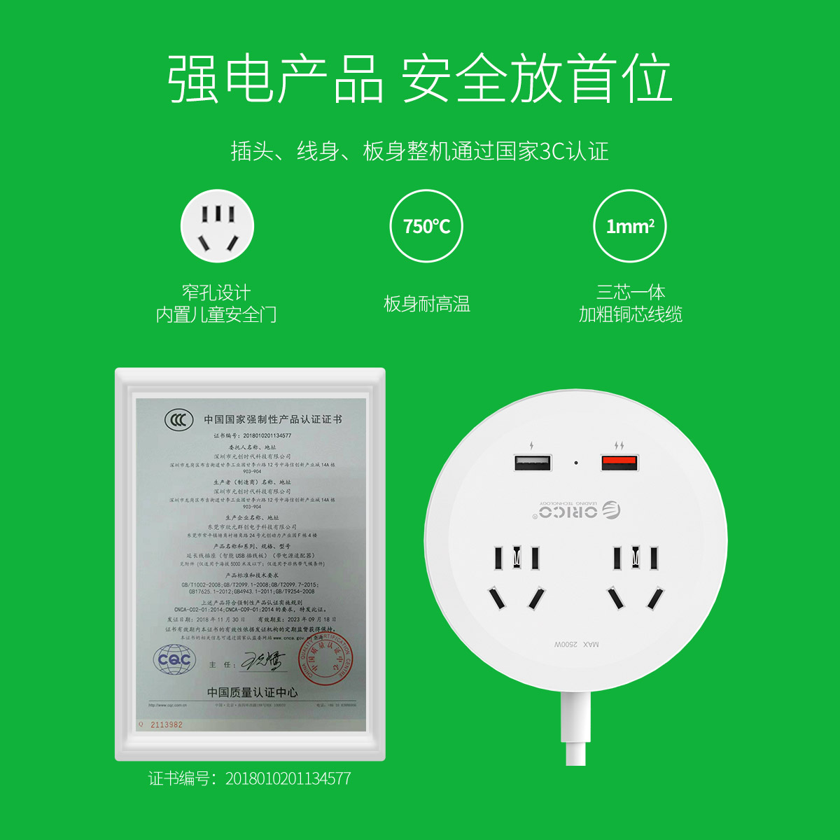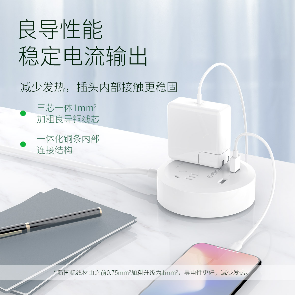 新國標5孔AC*2 + USB*1 + QC3.0*1,1.5米線長,圓形板身。