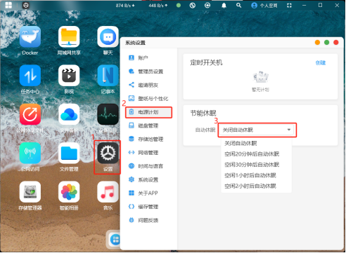 點(diǎn)擊首頁(yè)的“設(shè)置”圖標(biāo),進(jìn)到系統(tǒng)設(shè)置界面,再點(diǎn)擊“電源計(jì)劃”,在節(jié)能休眠處選擇自動(dòng)休眠模式。