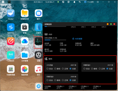 2.可自行選擇并調節設備各風扇的轉速檔位